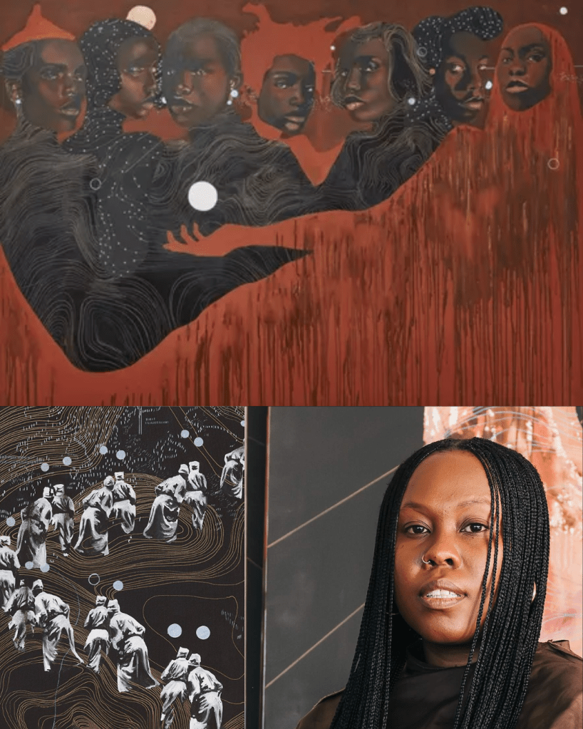 Manyaku Mashilo is a Cape Town-based artist whose multidimensional practice encompasses mixed-media painting, drawing, and collage. Born in Limpopo in 1991, she addresses themes of spiritual identity, memory, ancestry, community and belonging. Mashilo draws on inspiration from photographic archives to build expansive scenes where imagined representatives of Blackness migrate through abstract liminal spaces. These scenes act as celestial cartographies, connecting the depicted Black figures through a felt mutuality of heritage, spirituality, shared ritual and intent.